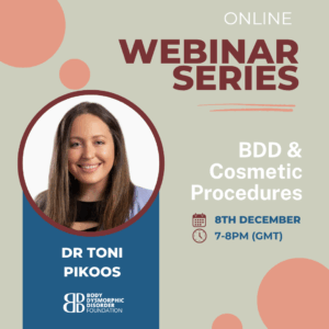 Supporting someone with BDD Are you a parent of a child with BDD? We know that it can be very scary as parent when your child is showing signs of BDD and it can be hard to know what to do and how to help Read More Do you have a friend or loved one with BDD? BDD can have a huge impact on the family, friends and partners of those struggling with the condition. Read More Are you an educational professional supporting a student with BDD? It is difficult to manage BDD alone. Having supportive people on the young person’s side will make it easier for them to get the right help. Read More Are you a mental health professional supporting a patient with BDD? Mental health professionals play an important role in correctly identifying BDD as the diagnosis driving that person’s distress. Read More More stories from the BDD community Nov 14, 2025 Winter Webinars – Cosmetic Procedures and BDD Read More Nov 14, 2025 We’re Hiring: Administrator Read More Nov 14, 2025 We’re Hiring: Project Manager Read More Nov 11, 2025 Kings College & ZOE Research Project Read More Nov 6, 2025 Winter Webinars – BDD by Proxy Read More Nov 5, 2025 Winter Webinars – Mirror Retraining Read More Nov 3, 2025 Winter Webinars – What should Good CBT for BDD Include? Read More Nov 3, 2025 Louise’s Recovery Story Read More Oct 31, 2025 Winter Webinars – Medication for BDD in Young People Read More Oct 28, 2025 Research Participants Needed Read More Oct 28, 2025 Research Participants Needed Read More Oct 9, 2025 Recent BDD Research sheds light on Parents’ Perspectives Read More Oct 6, 2025 Beating BDD Podcast #34 – Gem Ponting Read More Oct 3, 2025 Marie’s Recovery Story Read More Oct 3, 2025 Share your Feedback for our Impact Report Read More Sep 10, 2025 BDD Collection of Poetry Read More Why not join our BDD community?? Home